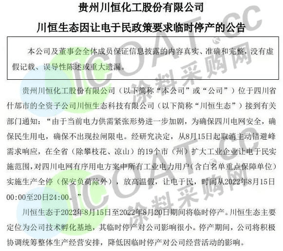 磷礦龍頭川恒股份:位于四川省什邡市的全資子公司川恒生態(tài)科技有限公司接到有關(guān)部門讓電于民政策要求,于8月15日至8月20日期間將臨時(shí)停產(chǎn)。