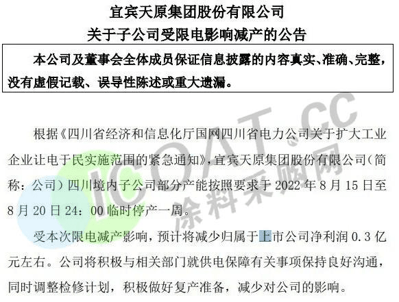 氯堿龍頭天原股份:四川境內(nèi)子公司部分產(chǎn)能按照要求于2022年8月15日至8月20日24時(shí)臨時(shí)停產(chǎn)一周。