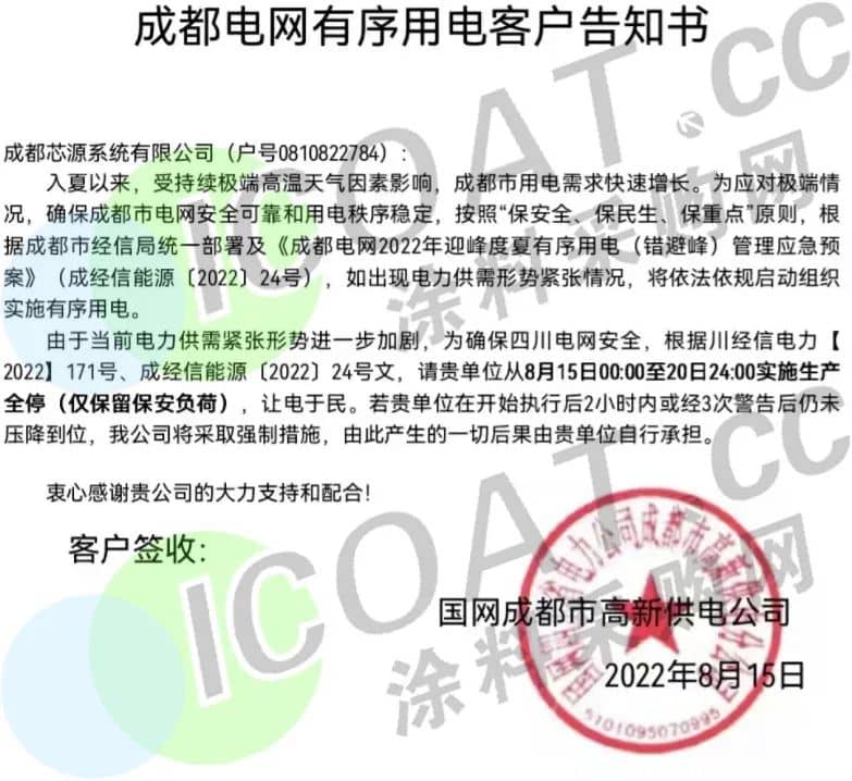國(guó)網(wǎng)成都市高新供電發(fā)布《成都電網(wǎng)有序用電客戶告知書》稱,從8月15日起0時(shí)至20日24時(shí)實(shí)施生產(chǎn)全停(僅保留保安負(fù)荷)讓電于民。若在開(kāi)始執(zhí)行后2小時(shí)內(nèi)或經(jīng)3次警告后仍未壓降到位,將采取強(qiáng)制措施。