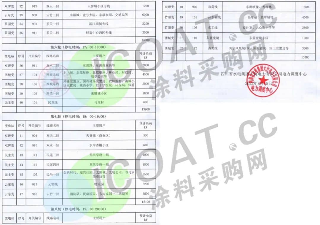 四川省水電集團(tuán)大竹電力發(fā)布迎峰度夏城區(qū)居民用電線路緊急限電序位表,要求16日各變電站按時(shí)間段進(jìn)行八輪限電,時(shí)間從11點(diǎn)到20點(diǎn),每個(gè)輪次停電1小時(shí)。