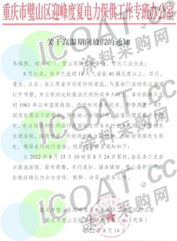 重慶高新區(qū)發(fā)布《關(guān)于工業(yè)企業(yè)高溫期間放假的緊急通知》稱,從2022年8月15日10時(shí)至8月24日零時(shí),全區(qū)各工業(yè)企業(yè)高溫放假。若有調(diào)整,另行通知。