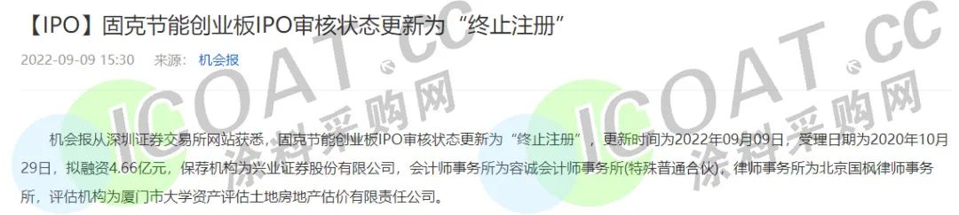 近日,知名涂料企業固克節能主動要求撤回注冊申請文件,根據《創業板首次公開發行股票注冊管理辦法(試行)》第三十條的規定,證監會決定終止對公司發行注冊程序,這也是固克節能二度闖關IPO并以失敗告終。