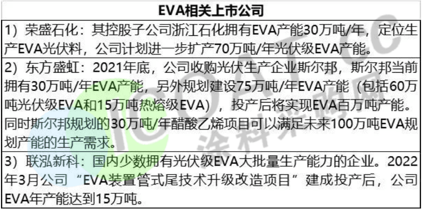 受乙烯減產及醋酸乙烯供給受限影響,2022-2023年我國光伏級EVA供需結構將維持緊平衡。海外EVA供給端的收緊將導致國內EVA進口端進一步受限,隨著我國EVA產能逐步投放,預計未來我國EVA進口依存度將進一步下降。