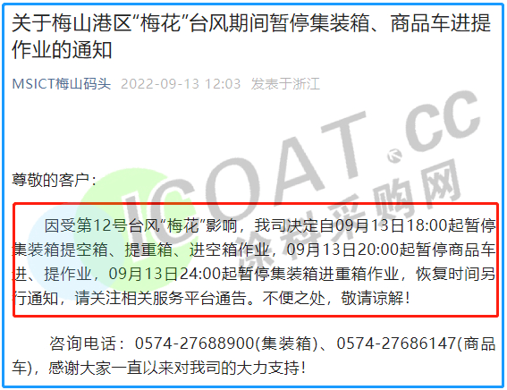 MSICT梅山碼頭決定自09月13日18:00起暫停集裝箱提空箱、提重箱、進空箱作業,09月13日20:00起暫停商品車進、提作業,09月13日24:00起暫停集裝箱進重箱作業。