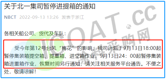 北侖北一集司計劃于9月13日18:00起暫停集裝箱提空箱、提重箱、進空箱作業,9月13日24:00起暫停集裝箱進重箱作業。