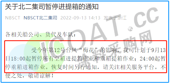 航運停運的同時,臺風“梅花”將襲擊全球最繁忙的集裝箱港口和中國第二大集裝箱港口寧波。多地碼頭陸續通知暫停提箱作業,華東地區或出現出貨不暢的局面!
