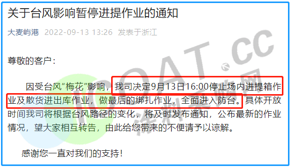 甬舟碼頭、大麥嶼港決定自9月13日(周二)18:00起暫停受理卡口提箱業務,13日24:00起暫停受理卡口所有進提箱業務。