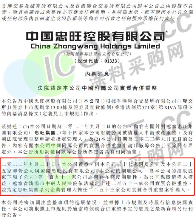近日,全球第二大及亞洲第一大工業鋁擠壓產品研發制造商——中國忠旺公告,因公司37家附屬公司及公司25家聯營公司與遼陽忠旺投資有限公司等191家公司之間存在高度關聯性,為公平保障債權人權益,遼寧省沈陽市中級人民法院依法裁定上述253家公司實質合并重整,此外公司股份繼續停牌。