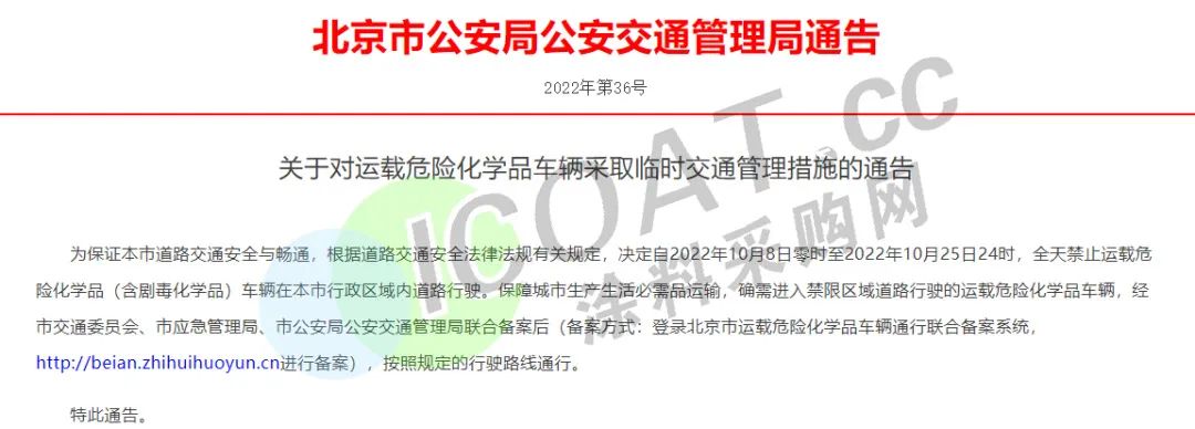 近日,北京市公安局公安交通管理局發布通告:為保證本市道路交通安全與暢通,決定自2022年10月8日零時至10月25日24時,全天禁止運載危險化學品(含劇毒化學品)車輛在本市行政區域內道路行駛。
