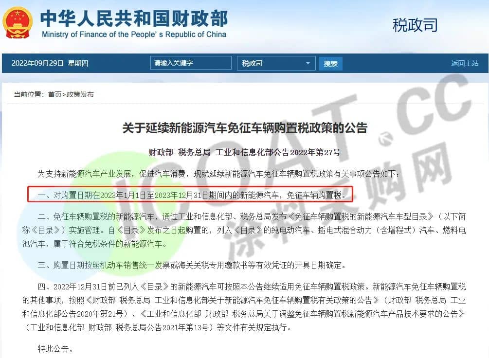近日,財政部、稅務(wù)總局、工信部三部門聯(lián)合發(fā)布公告稱,對購置日期在2023年1月1日至2023年12月31日期間內(nèi)的新能源汽車,免征車輛購置稅,以支持新能源汽車產(chǎn)業(yè)發(fā)展,促進(jìn)汽車消費。這已經(jīng)是新能源汽車免征購置稅政策第三次延期,也證明了國家對于新能源汽車的大力扶持。