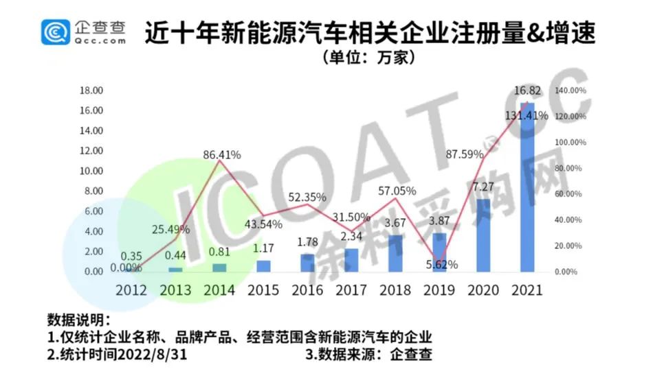 數(shù)據(jù)顯示,我國現(xiàn)存新能源汽車相關(guān)企業(yè)50.56萬家。2022年上半年,我國新增新能源汽車相關(guān)企業(yè)11.04萬家,同比增長50.89%。2021年新增16.82萬家,同比增長131.41%;2020年新增7.27萬家,同比增長87.59%……值得注意的是,除了新成立注冊的企業(yè)外,還有不少各行各業(yè)的企業(yè)跨界前來分羹。
