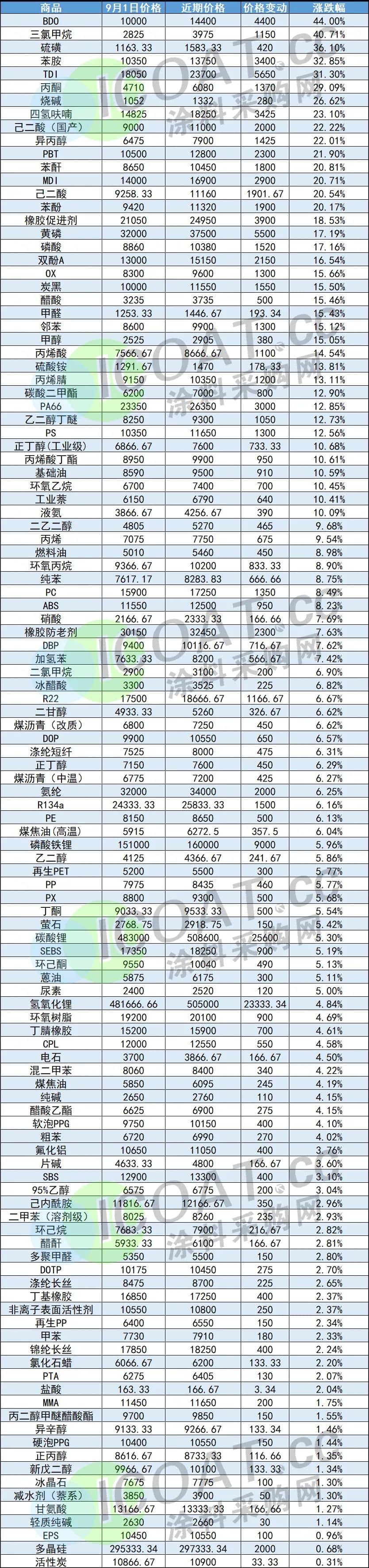 大廠的瘋狂漲價(jià)無疑也帶動(dòng)了化工市場(chǎng)原材料價(jià)格的上揚(yáng)態(tài)勢(shì),據(jù)涂料采購網(wǎng)不完全統(tǒng)計(jì),僅9月初至今就有100余種化工品價(jià)格上漲,BDO、三氯甲烷等漲幅超過4成,硫酸、苯胺、TDI等產(chǎn)品漲幅超過3成。