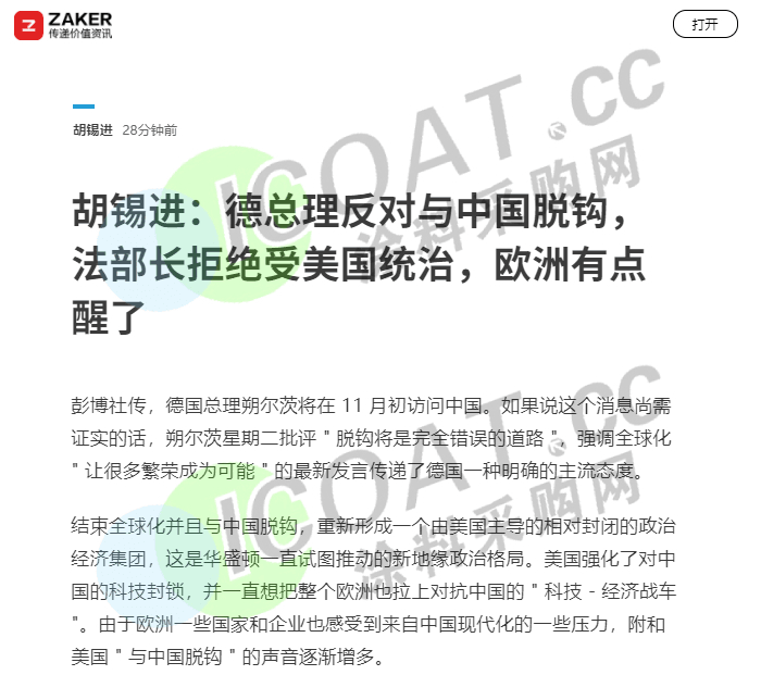 其還表示,現在歐洲一些精英似乎開始清醒了,中國與歐洲不存在地緣政治矛盾,美國一再把中國當成整個西方的地緣政治對手宣傳塑造,為的全是華盛頓一己之私。由于美國對歐洲精英有很強的控制力,后者中的一些人不顧歐洲利益,把美國的戰略詭計當成歐洲的利益搖旗吶喊。