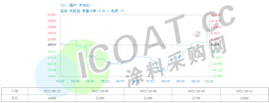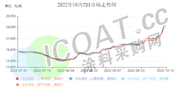 國慶節(jié)后,TDI價格五連漲達到24366元/噸,月內上漲超過21%。從8月初的15000元/噸上漲至今,TDI本輪上漲周期已經超過70天,漲幅超過60%,刷新近四年來新高。歐洲多套TDI裝置停車,國內開工率也進入年內低點,供應端的緊缺使得TDI漲勢依舊強勢。