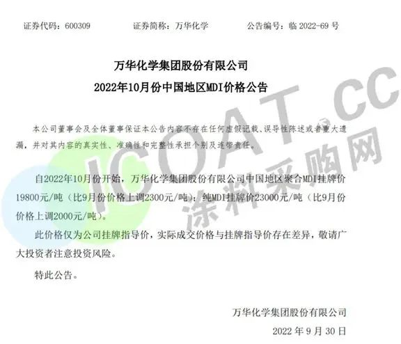 隨著冬季供暖的要求,MDI部分需求將在10月被釋放出來;國外方面,近期海外能源危機問題仍較為突出,利好MDI價格。陶氏歐洲或自9月1日起對歐洲市場MDI、聚醚和組合料產品進行漲價,上漲幅度為200歐元/噸(約合人民幣1368元人民幣/噸)。萬華化學自10月份開始,中國地區(qū)聚合MDI上調2300元/噸,純MDI上調2000元/噸。