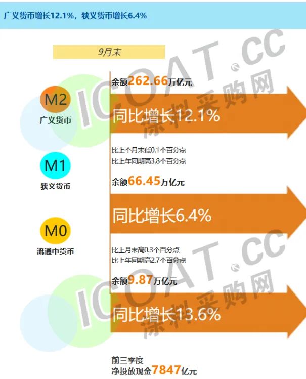 9月末,廣義貨幣(M2)余額262.66萬億元,同比增長12.1%,增速比上月末低0.1個百分點,比上年同期高3.8個百分點;狹義貨幣(M1)余額66.45萬億元,同比增長6.4%,增速分別比上月末和上年同期高0.3個和2.7個百分點;流通中貨幣(M0)余額9.87萬億元,同比增長13.6%。前三季度凈投放現金7847億元。