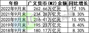 廣義貨幣(M2)余額從2018年9月末的180.17萬億元增至今年9月末的262.66萬億元,增長了82.49萬億元,漲幅達45.78%。近五年來,9月末廣義貨幣(M2)余額同比漲幅一直處于8.3%以上,今年更是創造近五年新高,同比增長達12.1%。