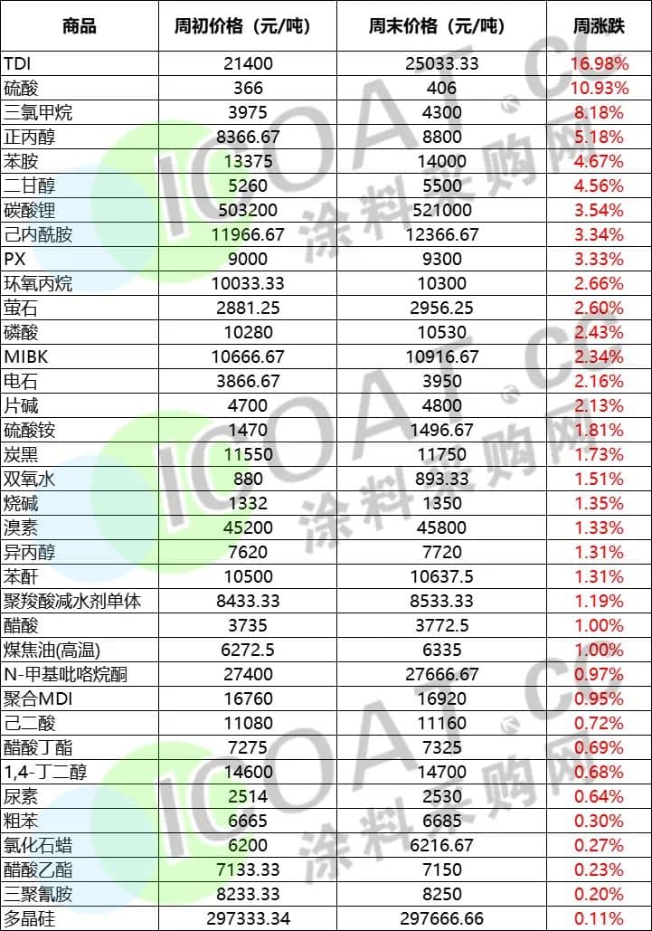 涂料上游的固化劑、鈦白粉、環氧樹脂等供應開始趨緊,部分區域價格也有上調預期。TDI價格自8月份以來漲幅超過50%,MDI產品單次上調2300元/噸,環氧丙烷下半年漲超4000元/噸,鈦白粉高端產品單次上漲2000元/噸。