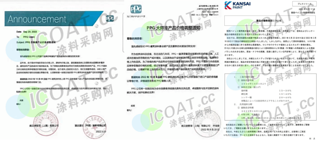 在此影響下,PPG、宣偉、阿克蘇諾貝爾等多家涂料企業官宣漲價,關西涂料全年上漲三次,涂料產品單次上漲30%;亞什蘭年內上漲三次,涂料產品累計上漲40%,PPG預計四季度同比上漲12%左右。