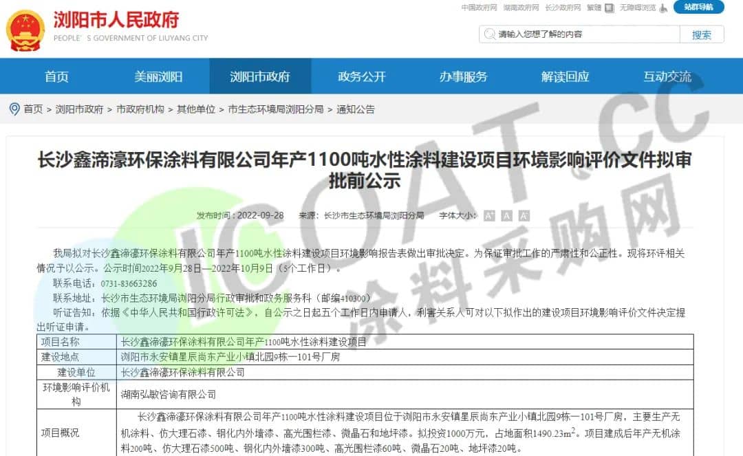 長沙鑫渧濠環保涂料有限公司:年產1100噸水性涂料建設項目,擬投資1000萬元。