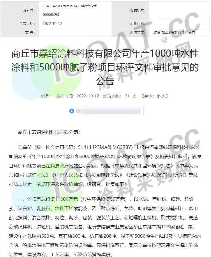商丘市嘉紹涂料科技有限公司:年產1000噸水性涂料和5000噸膩子粉項目,總投資11000萬元。