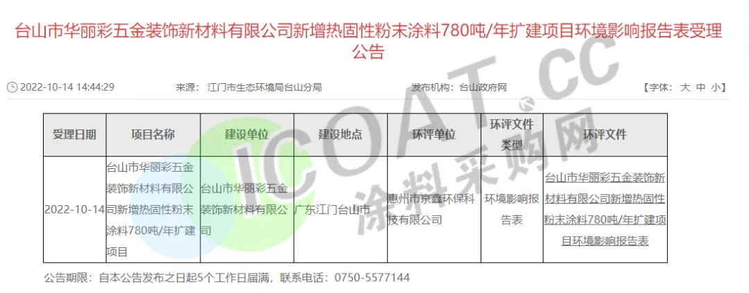 臺山市華麗彩五金裝飾新材料有限公司:新增熱固性粉末涂料780噸/年擴建項目,總投資992萬元。