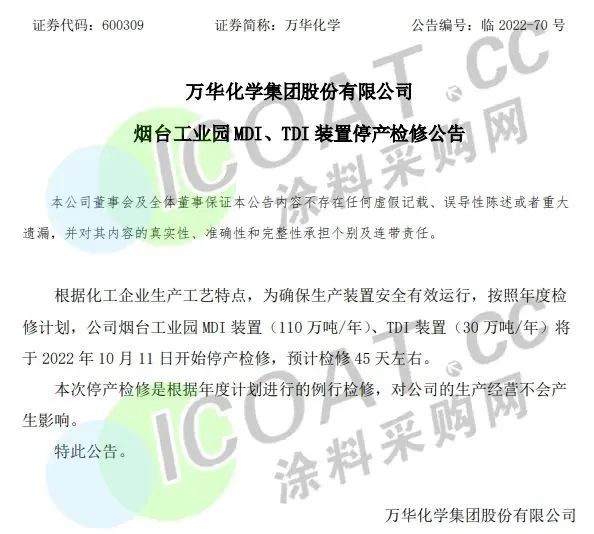 近日,化工“一哥”萬華化學發布檢修公告,稱其煙臺工業園MDI 裝置(110 萬噸/年)、TDI裝置(30萬噸/年)將于2022年10月11日開始停產檢修,預計檢修45天左右。
