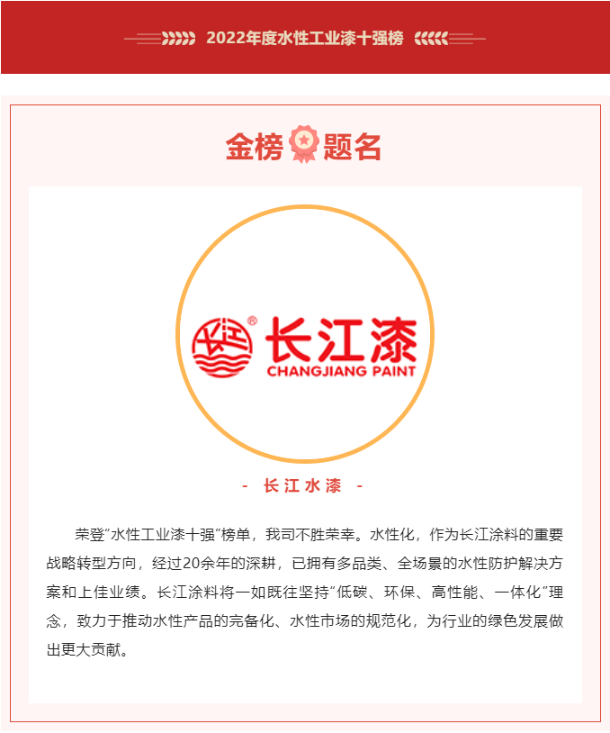 在經過近一年時間的市場調研,并結合線下企業推薦、線上評選、專家團隊評審等多個環節,最終評選出了以長江涂料、華豹涂料、九西水漆、江蘇科祥、海聯涂料、祿源漆業、六緣水漆、擎天材料科技、櫻花水漆、安幸水漆為代表的水性工業漆十強。為機械、工程、橋梁、鋼鐵等多個行業領域提供切實可行的參考。