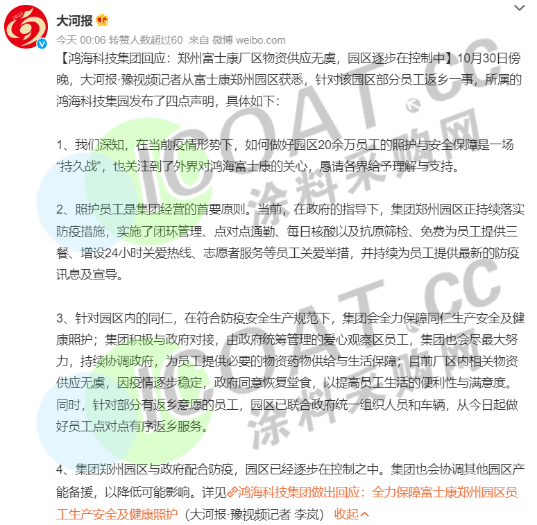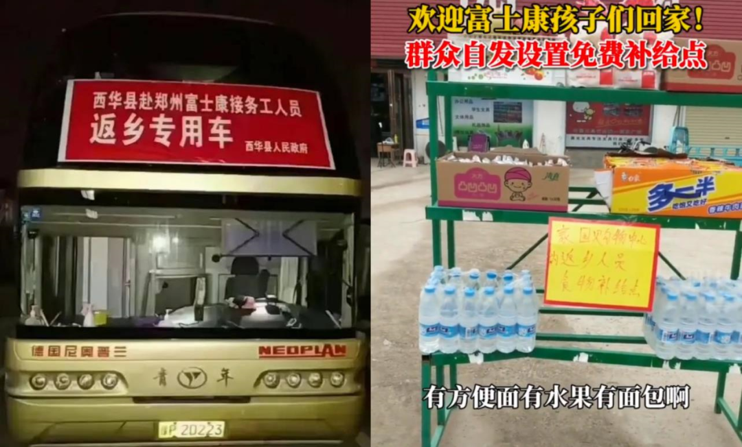 富士康表示,從10月30起,做好員工點(diǎn)對(duì)點(diǎn)有序返鄉(xiāng)服務(wù)。截至當(dāng)日下午,河南禹州市、長葛市、伊川縣、許昌市襄城縣、魏都區(qū)、周口市西華縣及商水縣、平頂山新華區(qū)、鶴壁市淇濱區(qū)、山城區(qū)、淇縣等多地均表示做好了當(dāng)?shù)貞艏畣T工返回家鄉(xiāng)的準(zhǔn)備。