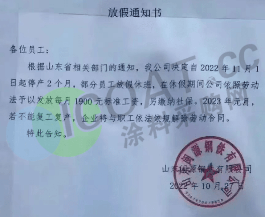 山東某鋼鐵廠表示,自11月1日起停產(chǎn)兩個(gè)月,休假期間依照勞動(dòng)法予以發(fā)放每月1900元標(biāo)準(zhǔn)工資。2023年元月,若不能復(fù)工復(fù)產(chǎn),企業(yè)將與職工依法依規(guī)解除勞動(dòng)合同。
