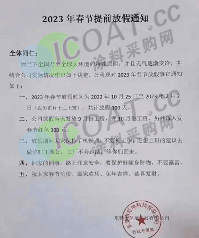 廣東東莞某工廠已于10月25日正式放年假,放假到2023年的2月2日,假期足足有100天之多!