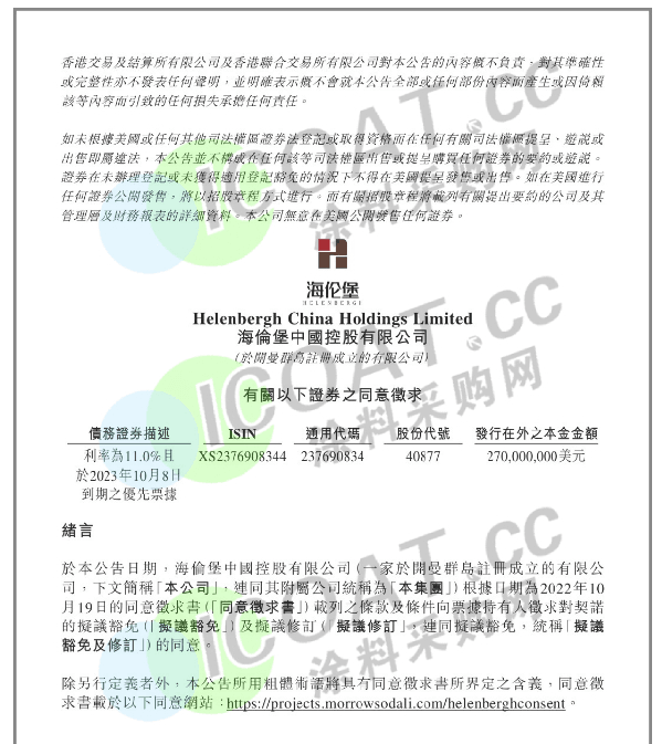 海倫堡中國控股有限公司公告,海倫堡未能償還于2023年3月24日到期的利率為11.0%的優先票據項下于2022年9月24日到期的利息及該等票據項下于2022年10月8日到期的利息。于本公告日期,海倫堡根據同意征求書載列之條款及條件,向票據持有人征求對契諾的擬議豁免及擬議修訂的同意。