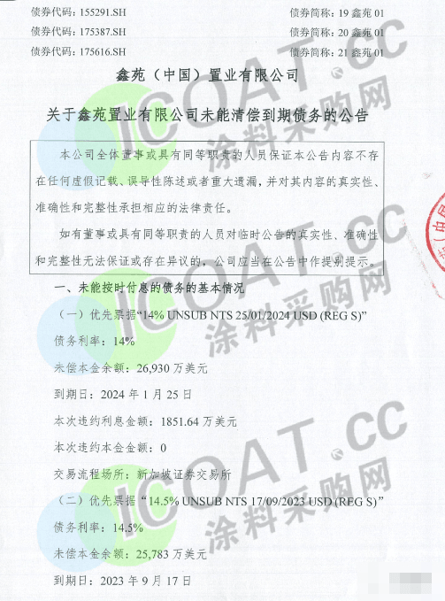 鑫苑(中國)置業有限公司發布鑫苑置業(XIN.US)關于未能清償到期債務的公告。鑫苑置業于新交所發行上市的優先票據“14% UNSUB NTS 25/01/2024 USD (REG S)”利息發生違約,金額為1851.64萬美元;另一只“14.5% UNSUB NTS 17/09/2023 USD (REG S)”利息及本金違約,金額分別為1869.27萬美元及22963萬美元。