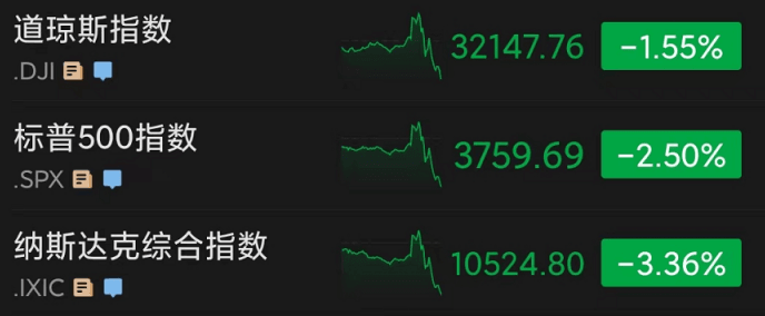 隨后美股三大指數集體跳水,截至收盤,道指跌505.44點,收于32147.76點,跌幅為1.55%,盤中一度漲超400點,收盤自高位回落超900點。標普500指數下跌2.5%,收于3759.69點。納指下跌3.36%,報收于10524.80點。美股三大股指目前已連跌三日,標普500指數創下10月7日來最大跌幅。