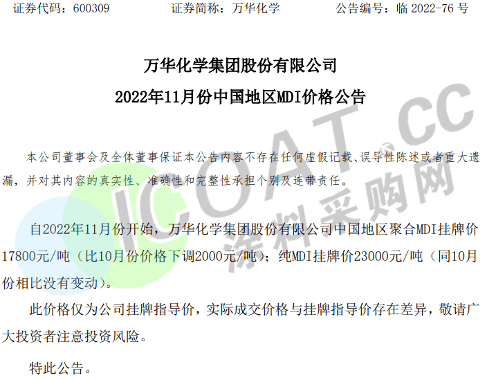 萬華化學近日公告,自2022年11月份開始,公司中國地區聚合MDI掛牌價17800元/噸,比10月份價格下調2000元/噸。