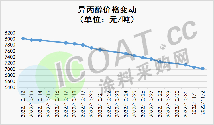 異丙醇從8008.33元/噸跌至7016.67元/噸,報價15連跌,累計下跌991.67元/噸,跌幅12.38%。