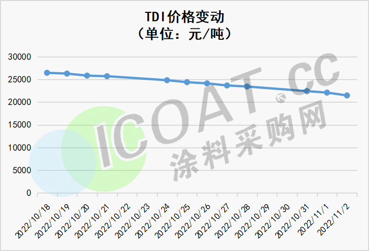 TDI從26433.33元/噸跌至21458.33元/噸,報價11連跌,累計下跌4975元/噸,跌幅18.82%。