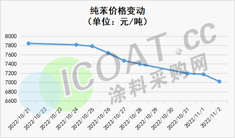 純苯從7842.5元/噸跌至7020元/噸,報價8連跌,累計下跌822.5元/噸,跌幅10.49%。