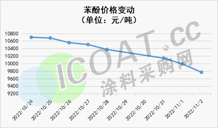 苯酚從10700元/噸跌至9768.75元/噸,報價7連跌,累計下跌931.25元/噸,跌幅8.70%。