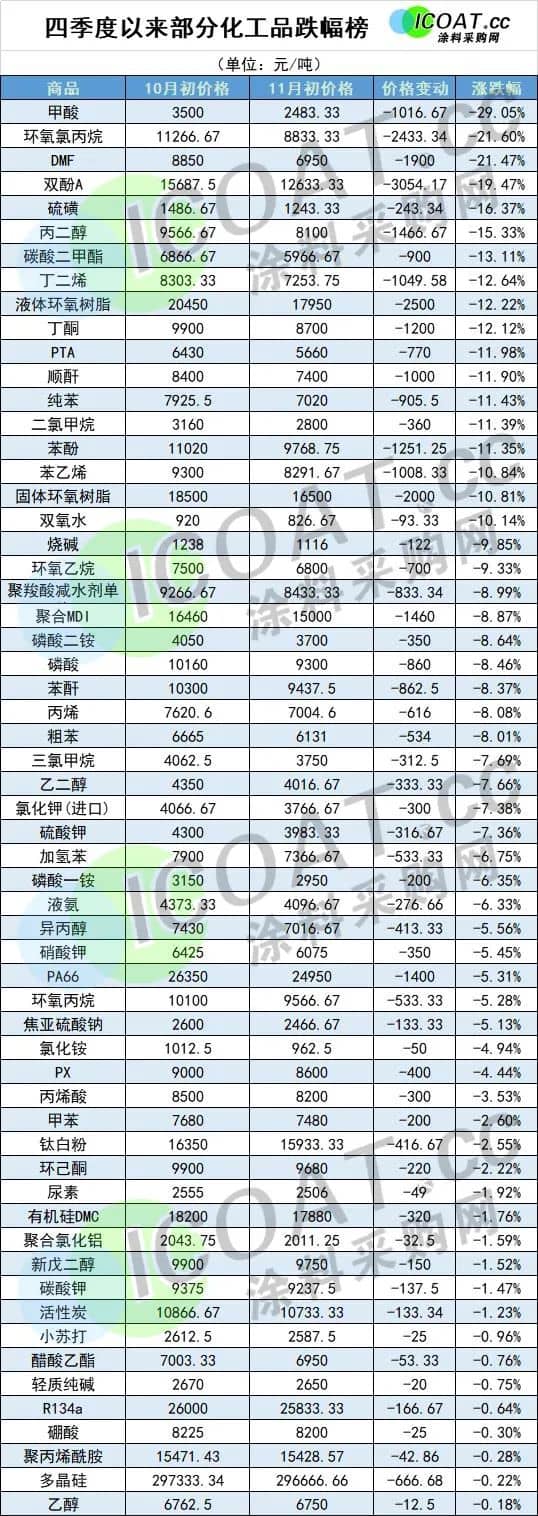 此外,四季度以來,60多種化工品報價下跌,甲酸、環氧氯丙烷、DMF等報價下滑近3成,雙酚A、硫磺、丙二醇等報價下調近2成,環氧樹脂、環氧氯丙烷、聚合MDI、苯乙烯等噸價下調超過千元。
