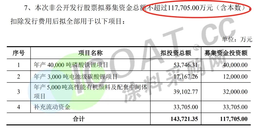 顏料龍頭百合花公告,擬定增募集資金總額不超過11.77億元,擬用于年產(chǎn)40000噸磷酸鐵鋰項(xiàng)目、年產(chǎn)3000噸電池級碳酸鋰項(xiàng)目、年產(chǎn)5000噸高性能有機(jī)顏料及配套中間體項(xiàng)目及補(bǔ)充流動資金。