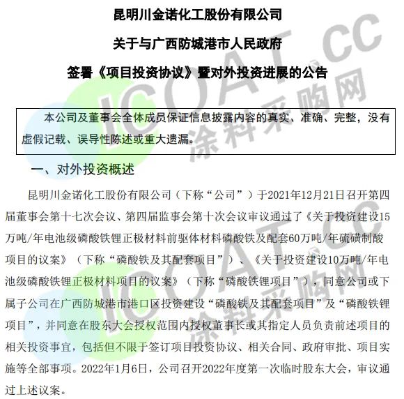 川金諾:擬在廣西防城港市港口區(qū)投建15萬噸/年電池級磷酸鐵鋰正極材料前驅(qū)體材料磷酸鐵及配套60萬噸/年硫磺制酸項(xiàng)目,預(yù)計(jì)總投資為15億元;投建10萬噸/年電池級磷酸鐵鋰正極材料項(xiàng)目,預(yù)計(jì)總投資為24億元。