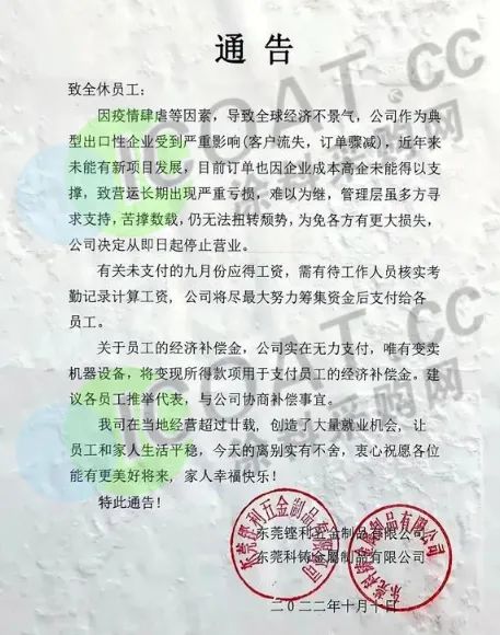 東莞鏗利五金制品有限公司:目前企業(yè)訂單因成本高企未能得以支撐,致?tīng)I(yíng)運(yùn)長(zhǎng)期出現(xiàn)嚴(yán)重虧損,難以為繼,決定從即日(10月10日)起停止?fàn)I業(yè)。