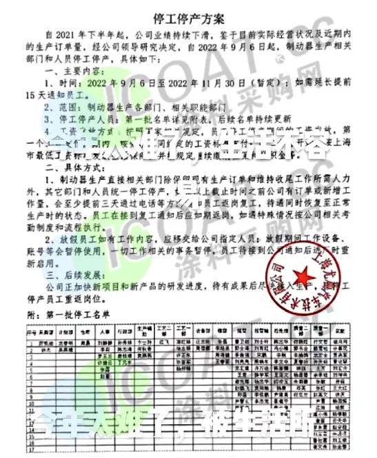 上海某汽車(chē)技術(shù)企業(yè)表示,鑒于目前實(shí)際經(jīng)營(yíng)狀況及近期內(nèi)的生產(chǎn)訂單量,研究決定制動(dòng)器生產(chǎn)相關(guān)部門(mén)和人員停工停產(chǎn),時(shí)間為自9月6日-11月30日(暫定)。