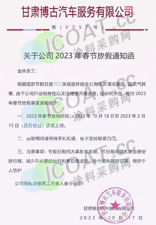 甘肅某汽車(chē)服務(wù)企業(yè)表示,2022年10月18日起放假,2023年2月15日(正月廿五)正式上班。