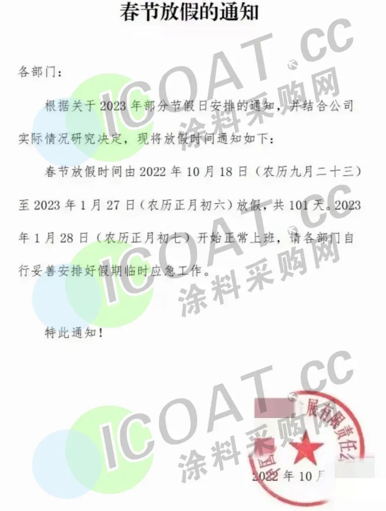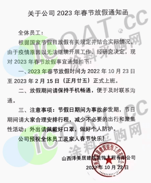 近日,陜西澤美居建筑裝飾工程有限公司發(fā)布《關(guān)于2023年春節(jié)放假通知函》,稱(chēng)由于疫情原因無(wú)法繼續(xù)開(kāi)展工作,研究決定2022年10月23日開(kāi)始春節(jié)放假,2023年2月15日(正月廿五)正式上班。