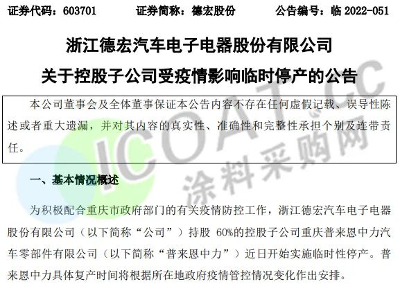德宏股份:為積極配合重慶市政府部門的有關疫情防控工作,企業持股60%的控股子公司重慶普來恩中力汽車零部件有限公司近日開始實施臨時性停產。