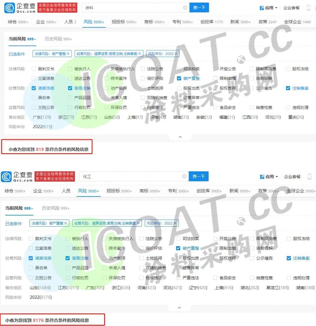 2022年以來涂料行業破產、倒閉、清算、注銷等超過800余家,化工行業超過8000余家,這意味著近萬家涂料、化工廠在這一年中因“經營不善”而黯然退市,企業的生命也被這四個字牢牢釘死。