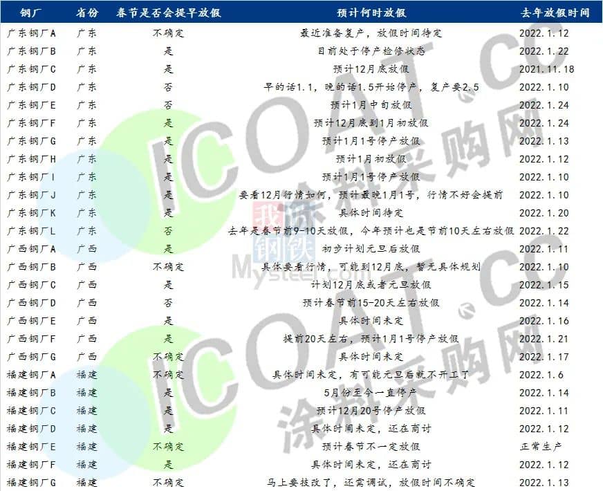 鋼鐵行業,臨近年底,下游需求逐步縮減,近期鋼材價格再次走低,電弧爐企業春節提前放假計劃提上日程。廣東、廣西、福建共計26家電弧爐鋼企,除去4家目前處于停產狀態的鋼廠之外,有13家鋼廠目前計劃于元旦前后,即春節提前20天以上停工放假,占比50%。