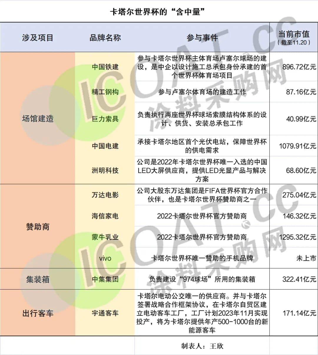 雖然中國男足再一次成為了看客,但是本屆世界杯仍舊和中國有著千絲萬縷的聯(lián)系,可以說是除了國足,我們能去世界杯的都去了,卡塔爾世界杯幾乎隨處可見“中國元素”。據(jù)涂料采購網(wǎng)不完全統(tǒng)計,中國鐵建、精工鋼構(gòu)、巨力索具、中國電建、洲明科技、中集集團(tuán)等企業(yè)都參與其中,涵蓋場館建造、集裝箱、出行客車等領(lǐng)域。